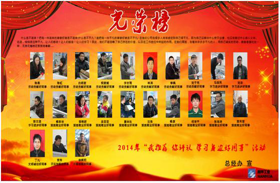 經(jīng)過精心籌備“南華工業(yè)2014學習身邊好同事”評選活動,共計評選出陳燕、楊新華等23位優(yōu)秀員工。